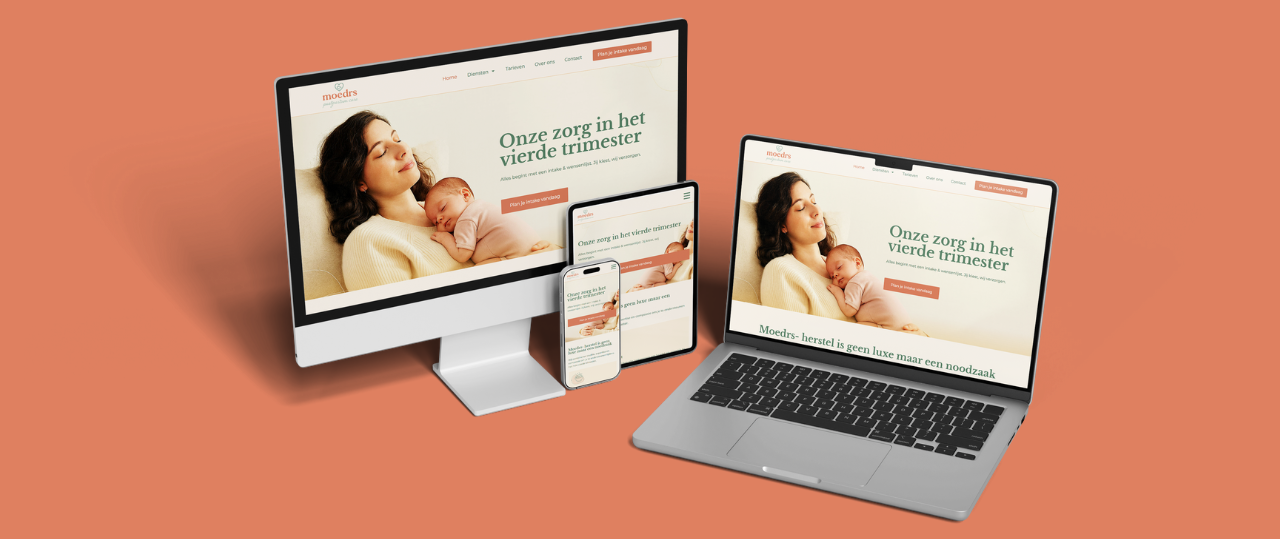 Voor Moedrs hebben we een warme en rustgevende website ontwikkeld die perfect aansluit bij de zorg en aandacht die zij bieden in het vierde trimester. De website begeleidt moeders stap voor stap vanaf de intake en wensenlijst tot aan de praktische ondersteuning na de bevalling. Met zachte kleuren, duidelijke informatie en een serene uitstraling voelt de site als een veilige plek – precies wat je mag verwachten van een organisatie die moeders ontzorgt in een van de meest kwetsbare periodes.