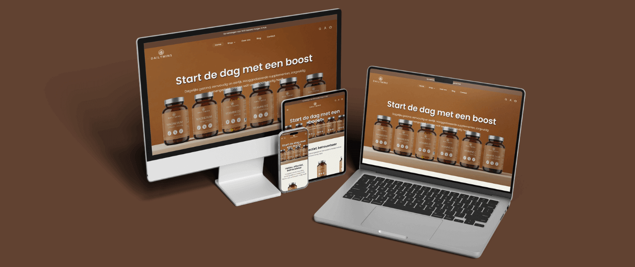 Voor DailyMins hebben we een overzichtelijke en frisse webshop ontwikkeld die het eenvoudig maakt om hoogwaardige supplementen te ontdekken en te bestellen. De website presenteert het assortiment duidelijk, met focus op eerlijkheid, kwaliteit en dagelijkse gezondheid. Dankzij de moderne uitstraling, gebruiksvriendelijke navigatie en duidelijke productinformatie kunnen bezoekers snel vinden wat hun lichaam nodig heeft en direct hun dagelijkse boost bestellen.